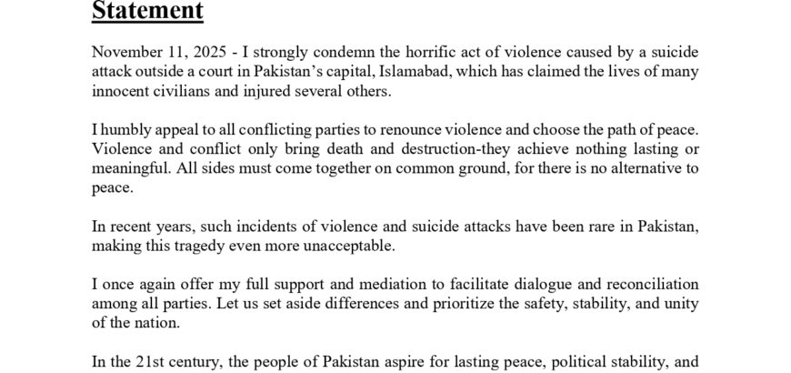 Mr. KC Statement on Violence in Pakistan - Call for Lasting Peace Statement November 11, 2025 - I strongly condemn the horrific act of violence caused by a suicide attack outside a court in Pakistan’s capital, Islamabad, which has claimed the lives of many innocent civilians and injured several others.