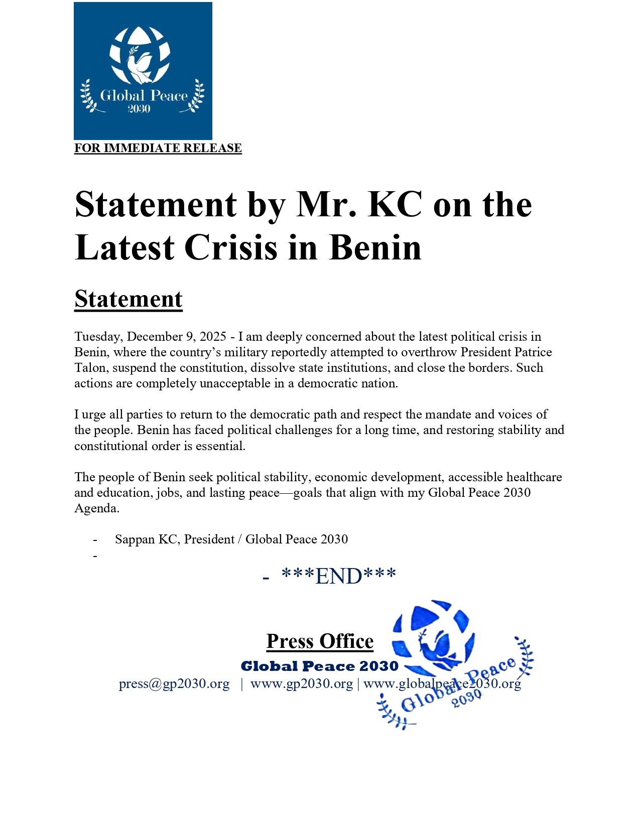 The people of Benin seek political stability, economic development, accessible healthcare and education, jobs, and lasting peace—goals that align with my Global Peace 2030 Agenda.