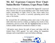 Mr. KC Expresses Concern Over Chad–Sudan Border Violence, Urges Peace Talks Monday, February