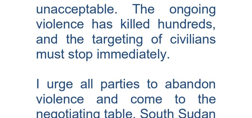 Unrest in South Sudan Is Unacceptable – Peace Is the Only Way Forward Unrest in South Sudan is unacceptable. The ongoing violence has killed hundreds, and the targeting of civilians must stop immediately. I urge all parties to abandon violence and come to the negotiating table. South Sudan needs