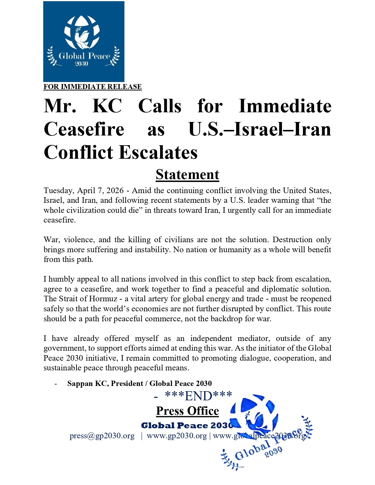 I have already offered myself as an independent mediator, outside of any government, to support efforts aimed at ending this war. As the initiator of the Global Peace 2030 initiative, I remain committed to promoting dialogue, cooperation, and sustainable peace through peaceful means.