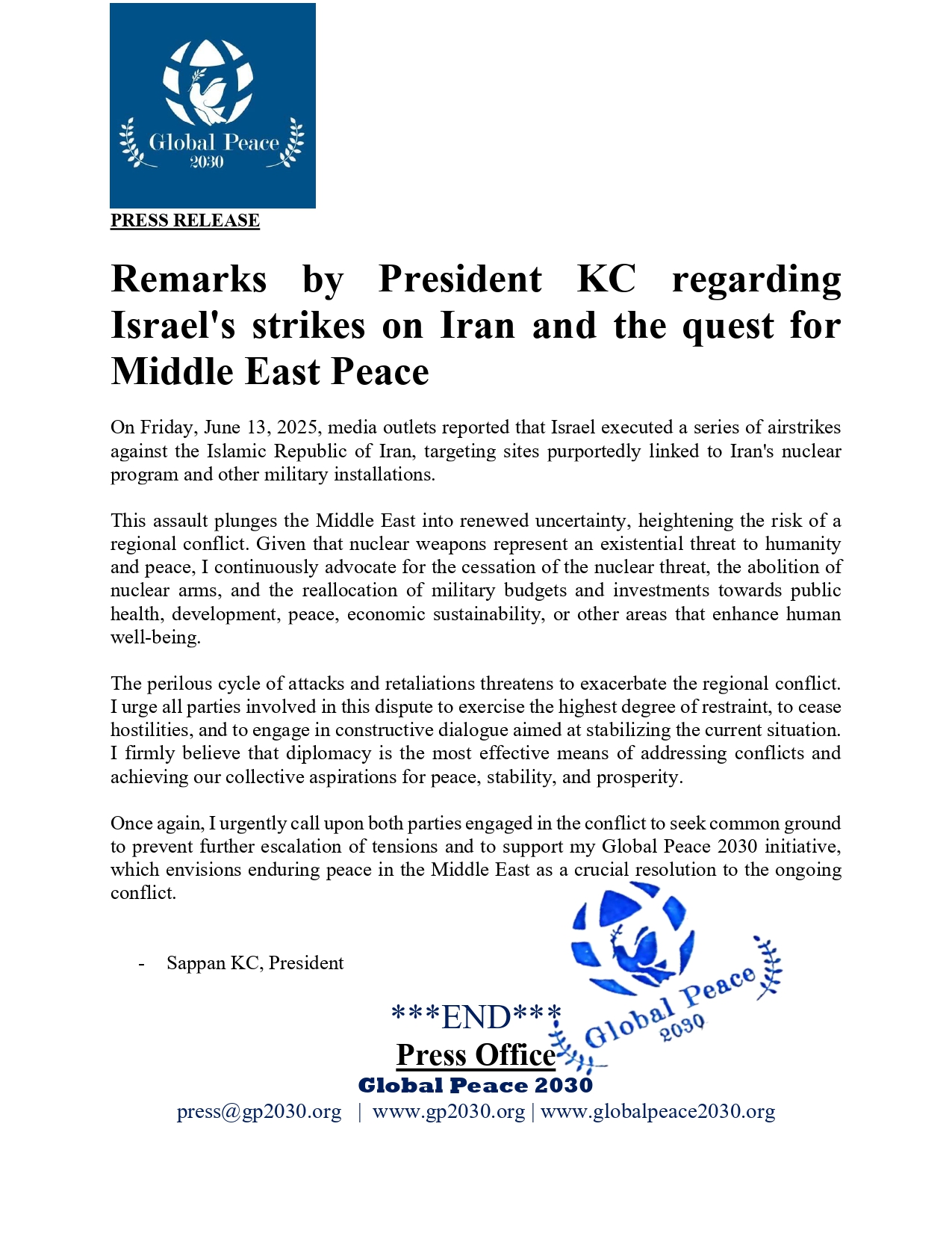 Once again, I urgently call upon both parties engaged in the conflict to seek common ground to prevent further escalation of tensions and to support my Global Peace 2030 initiative, which envisions enduring peace in the Middle East as a crucial resolution to the ongoing conflict.