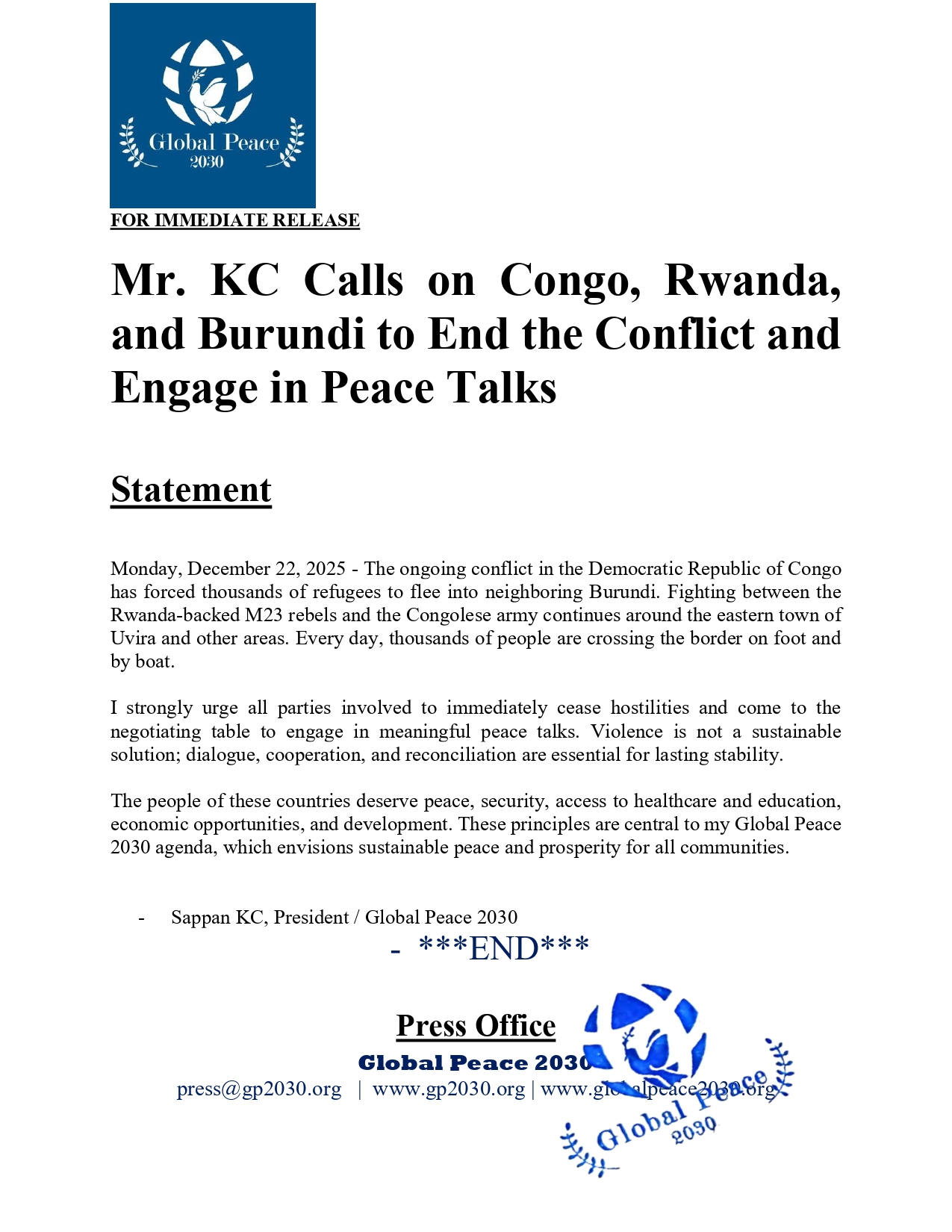 Mr. KC Calls on Congo, Rwanda, and Burundi to End the Conflict and Engage in Peace Talks