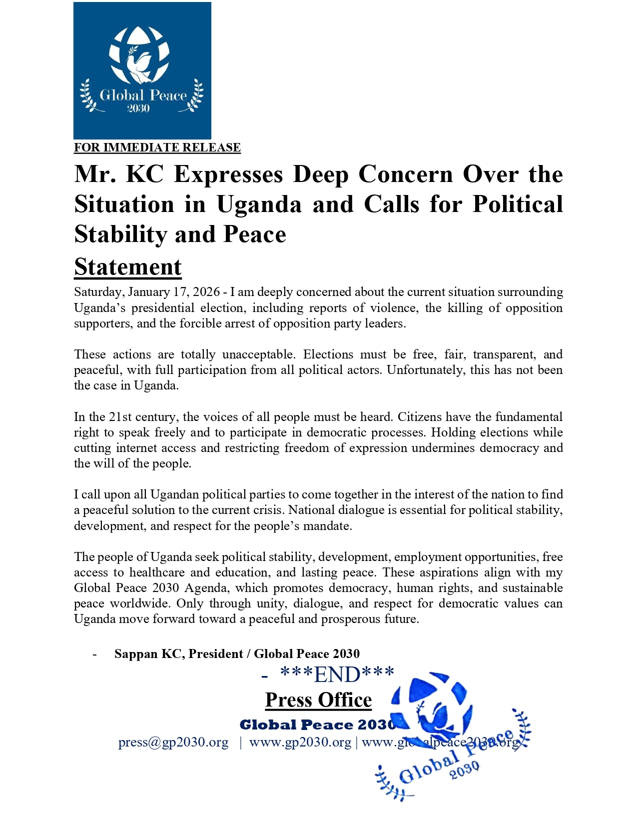 The people of Uganda seek political stability, development, employment opportunities, free access to healthcare and education, and lasting peace. These aspirations align with my Global Peace 2030 Agenda, which promotes democracy, human rights, and sustainable peace worldwide. Only through unity, dialogue, and respect for democratic values can Uganda move forward toward a peaceful and prosperous future.