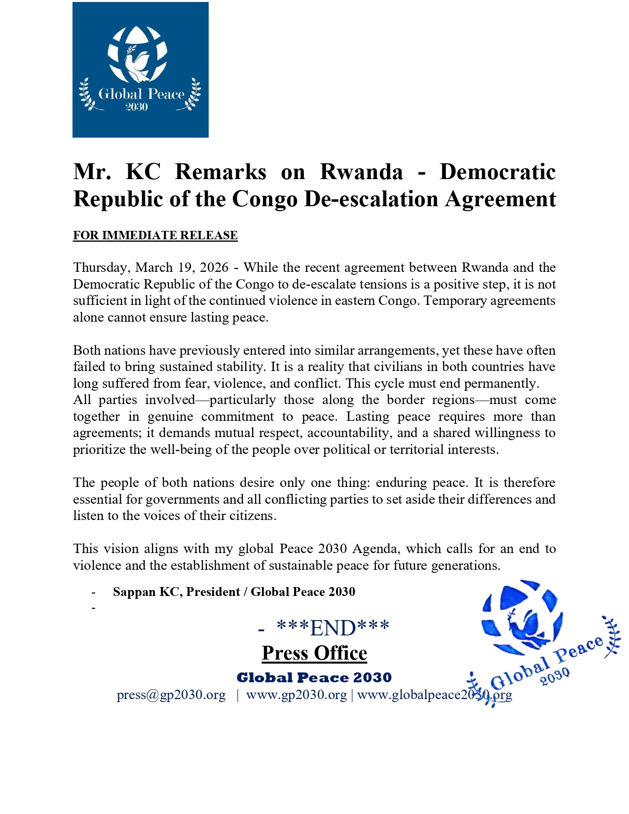 This vision aligns with my global Peace 2030 Agenda, which calls for an end to violence and the establishment of sustainable peace for future generations.