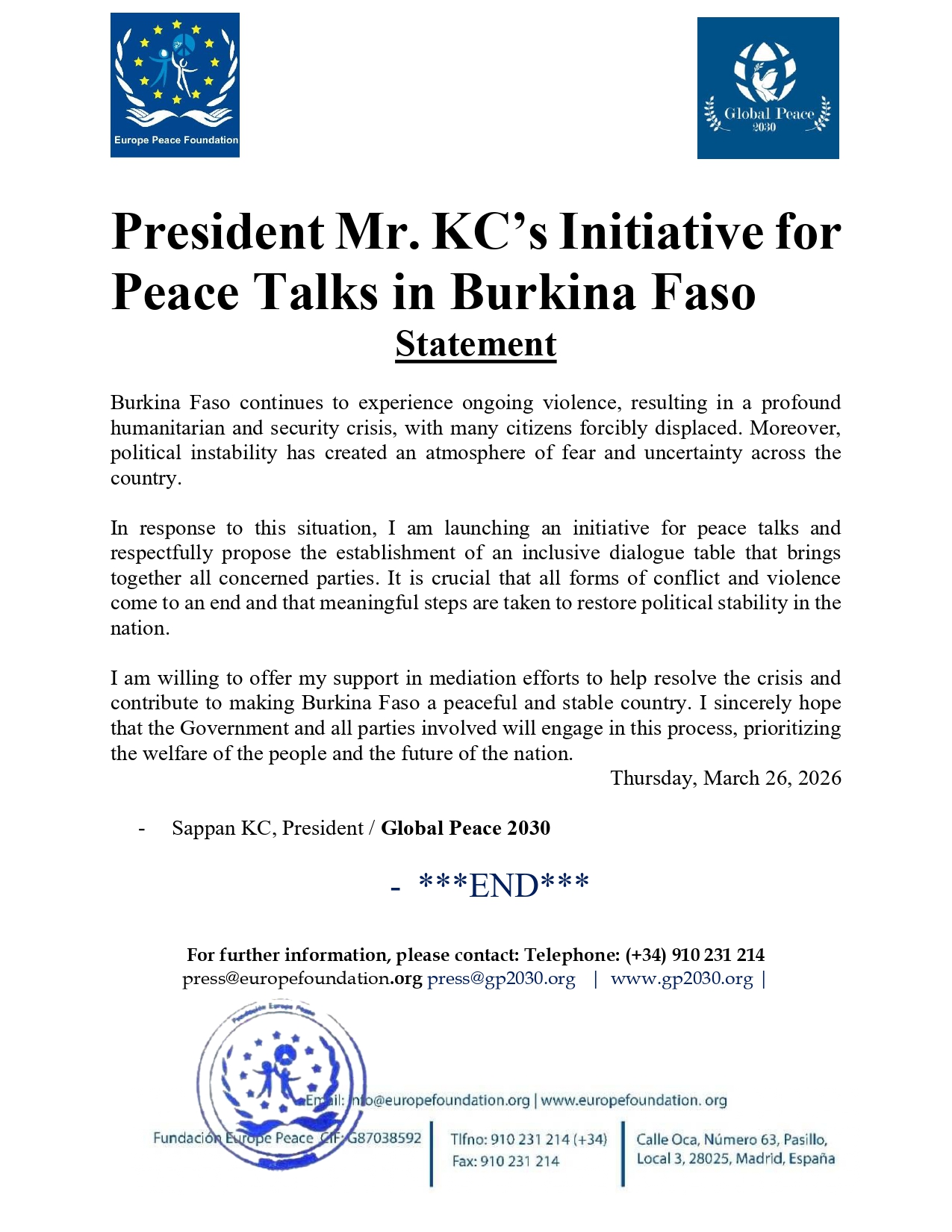 President Mr. KC’s Initiative for Peace Talks in Burkina Faso