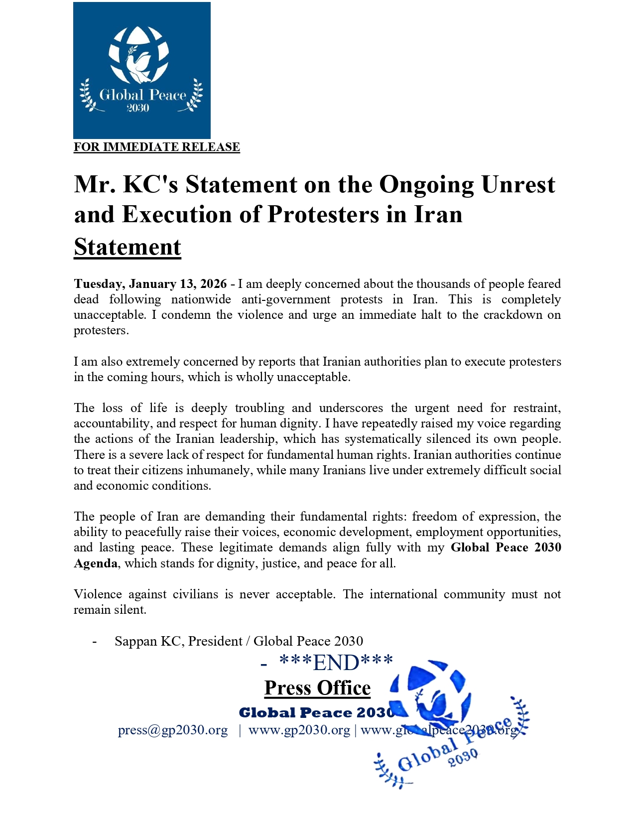 The people of Iran are demanding their fundamental rights: freedom of expression, the ability to peacefully raise their voices, economic development, employment opportunities, and lasting peace. These legitimate demands align fully with my Global Peace 2030 Agenda, which stands for dignity, justice, and peace for all.