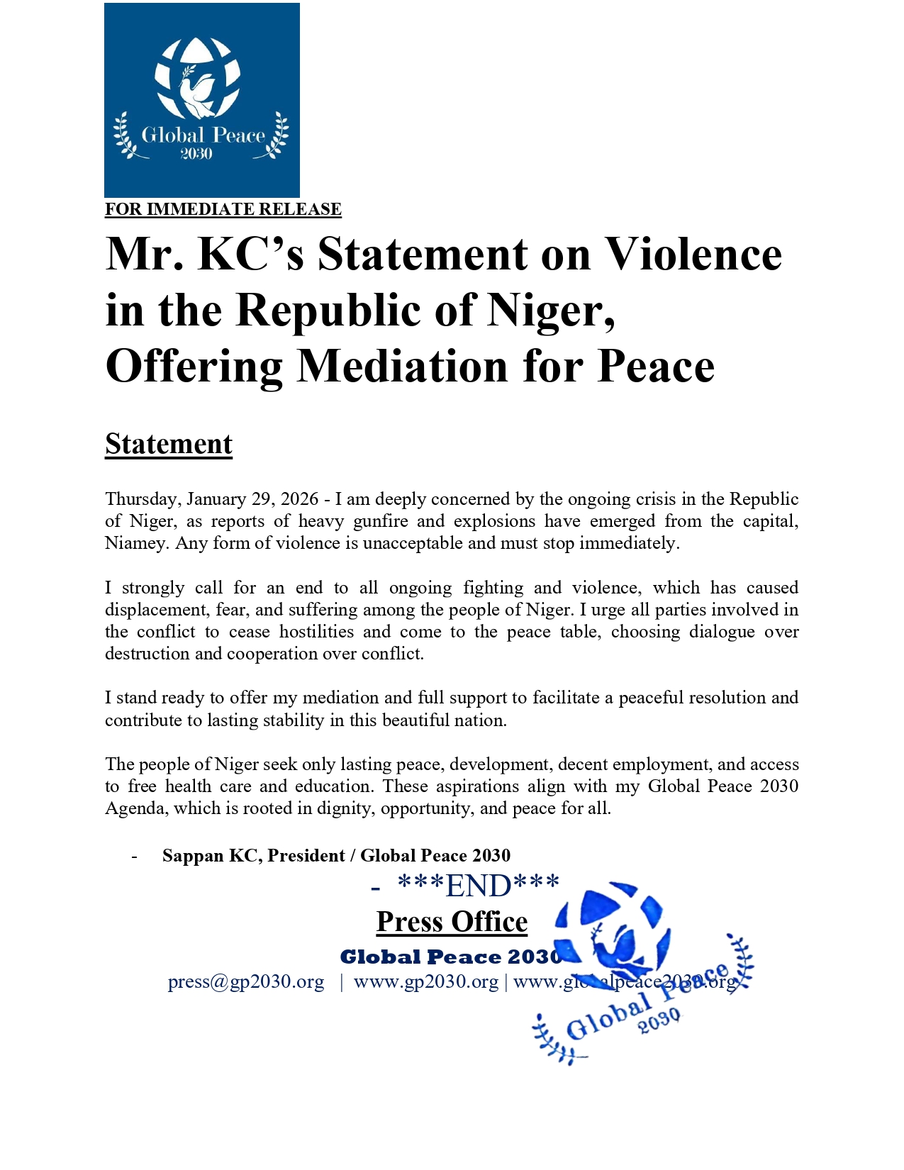 Mr. KC’s Statement on Violence in the Republic of Niger, Offering Mediation for Peace