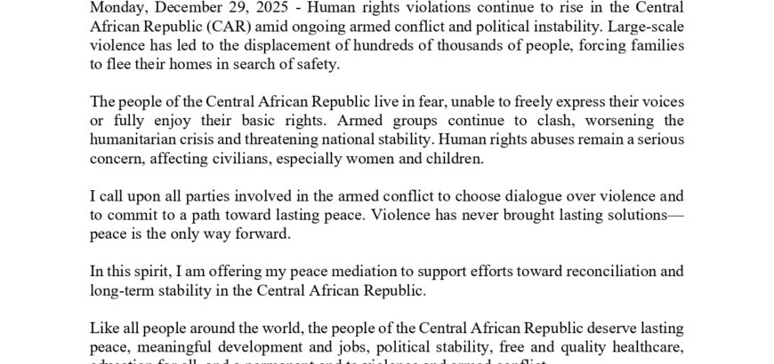 Mr. KC Offers Peace Mediation to End Conflict and Violence in the Central African Republic Statement Monday, December 29, 2025 - Human rights violations continue to rise in the Central African Republic (CAR) amid ongoing armed conflict and political instability. Large-scale violence has led to the displacement of hundreds of