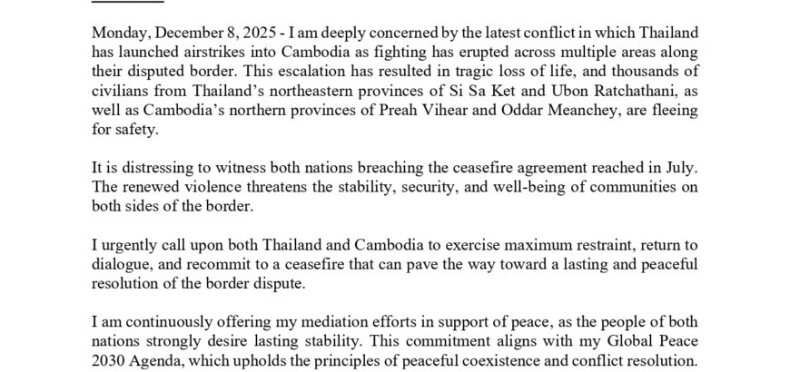 Mr. KC’s Statement on the Thailand-Cambodia Conflict, Calls for Maximum Restraint Statement Monday, December 8, 2025 - I am deeply concerned by the latest conflict in which Thailand has launched airstrikes into Cambodia as fighting has erupted across multiple areas along their disputed border. This escalation has resulted in tragic