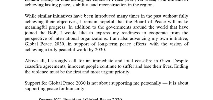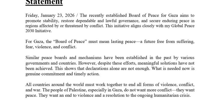 Mr. Sappan KC’s Remarks on the Gaza “Board of Peace” Statement Friday, January 23, 2026 / The recently established Board of Peace for Gaza aims to promote stability, restore dependable and lawful governance, and secure enduring peace in regions affected by or threatened by conflict. This initiative aligns closely with