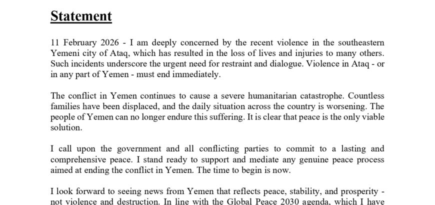 Statement by Mr. KC on the Situation in Yemen Statement 11 February 2026 - I am deeply concerned by the recent violence in the southeastern Yemeni city of Ataq, which has resulted in the loss of lives and injuries to many others. Such incidents underscore the urgent need for restraint