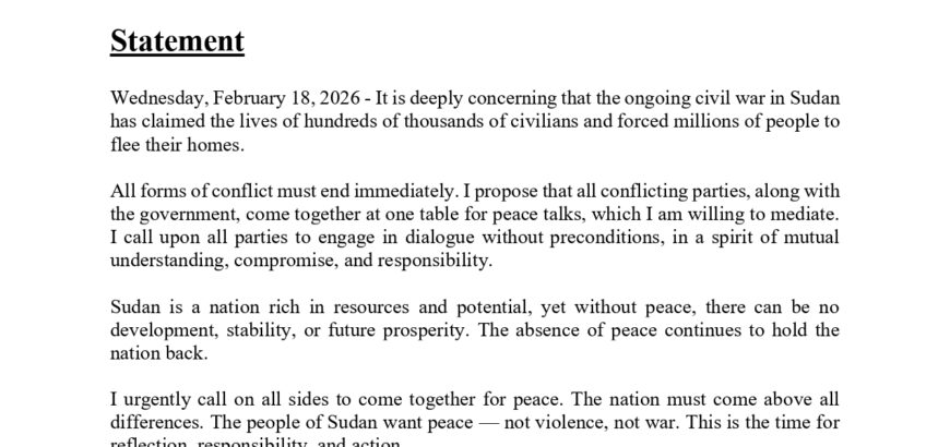 Wednesday, February 18, 2026 - President Mr. Sappan KC has formally offered to mediate peace talks to help bring an end to the ongoing conflict in Sudan. He calls on all conflicting parties and government representatives to immediately cease hostilities and come together for constructive and inclusive dialogue. He urges