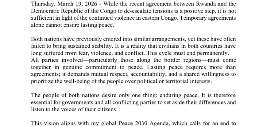 Mr. KC Remarks on Rwanda - Democratic Republic of the Congo De-escalation Agreement FOR IMMEDIATE RELEASE Thursday, March 19, 2026 - While the recent agreement between Rwanda and the Democratic Republic of the Congo to de-escalate tensions is a positive step, it is not sufficient in light of the continued