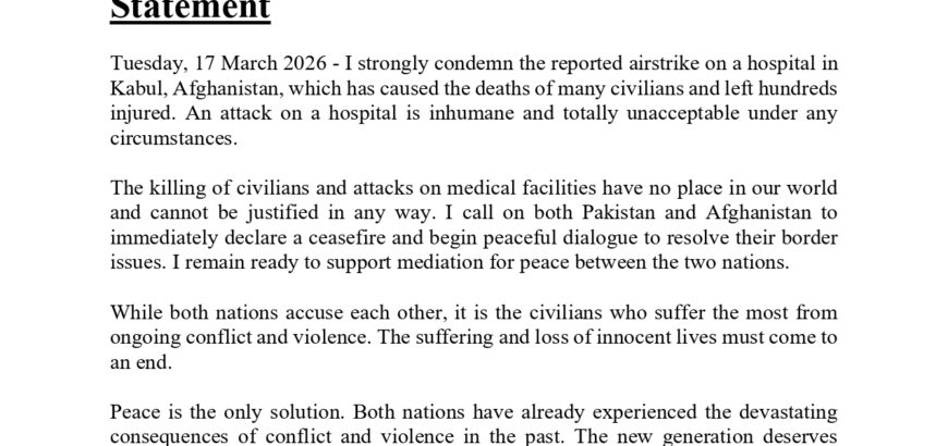 Mr. KC Condemns Inhumane Attack on Hospital in Afghanistan Statement Tuesday, 17 March 2026 - I strongly condemn the reported airstrike on a hospital in Kabul, Afghanistan, which has caused the deaths of many civilians and left hundreds injured. An attack on a hospital is inhumane and totally unacceptable under
