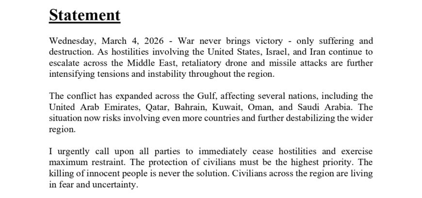 Mr. KC Strongly Calls for Immediate Ceasefire as U.S.–Israel War with Iran Escalates Across the Gulf and Wider Middle East Statement Wednesday, March 4, 2026 - War never brings victory - only suffering and destruction. As hostilities involving the United States, Israel, and Iran continue to escalate across the Middle