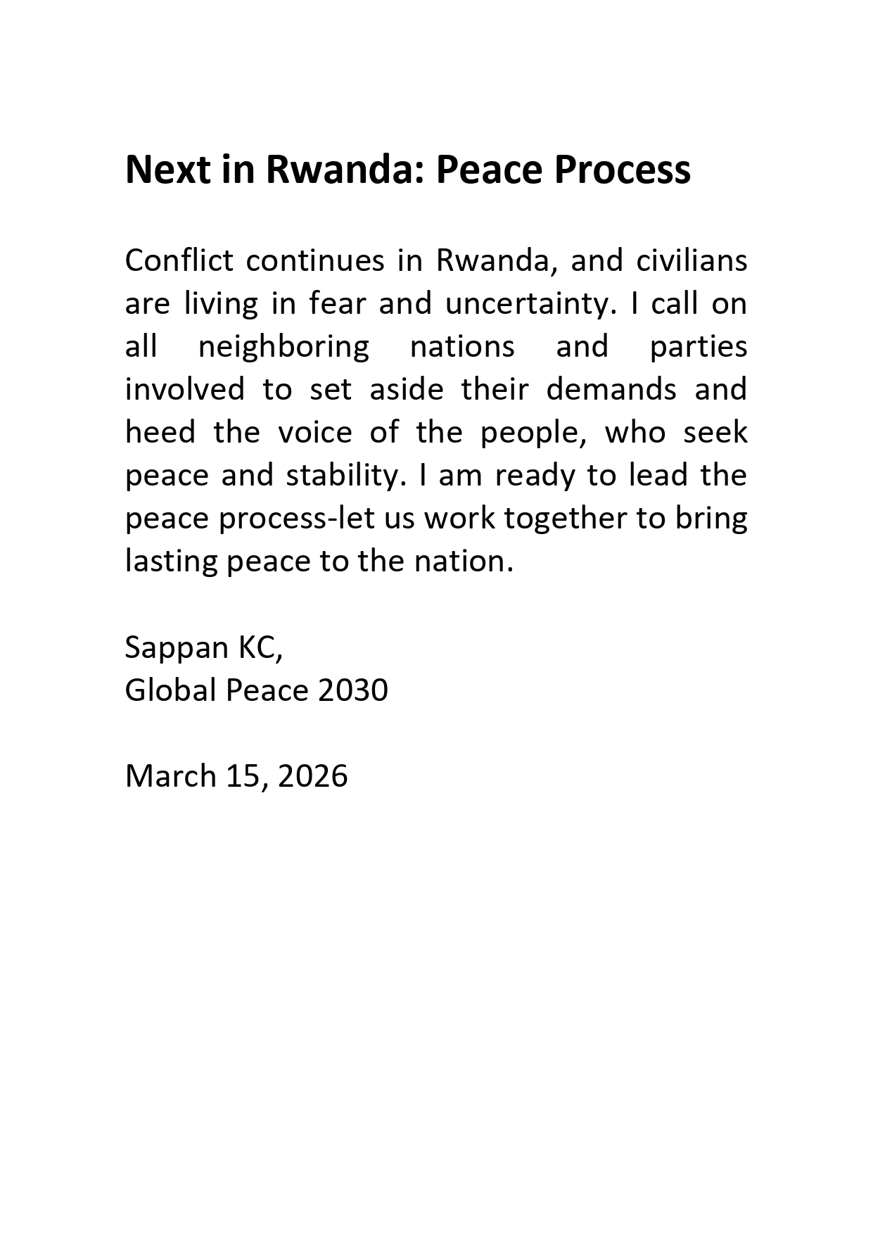 Conflict continues in Rwanda, and civilians are living in fear and uncertainty. I call on all neighboring nations and parties involved to set aside their demands and heed the voice of the people, who seek peace and stability. I am ready to lead the peace process-let us work together to bring lasting peace to the nation.