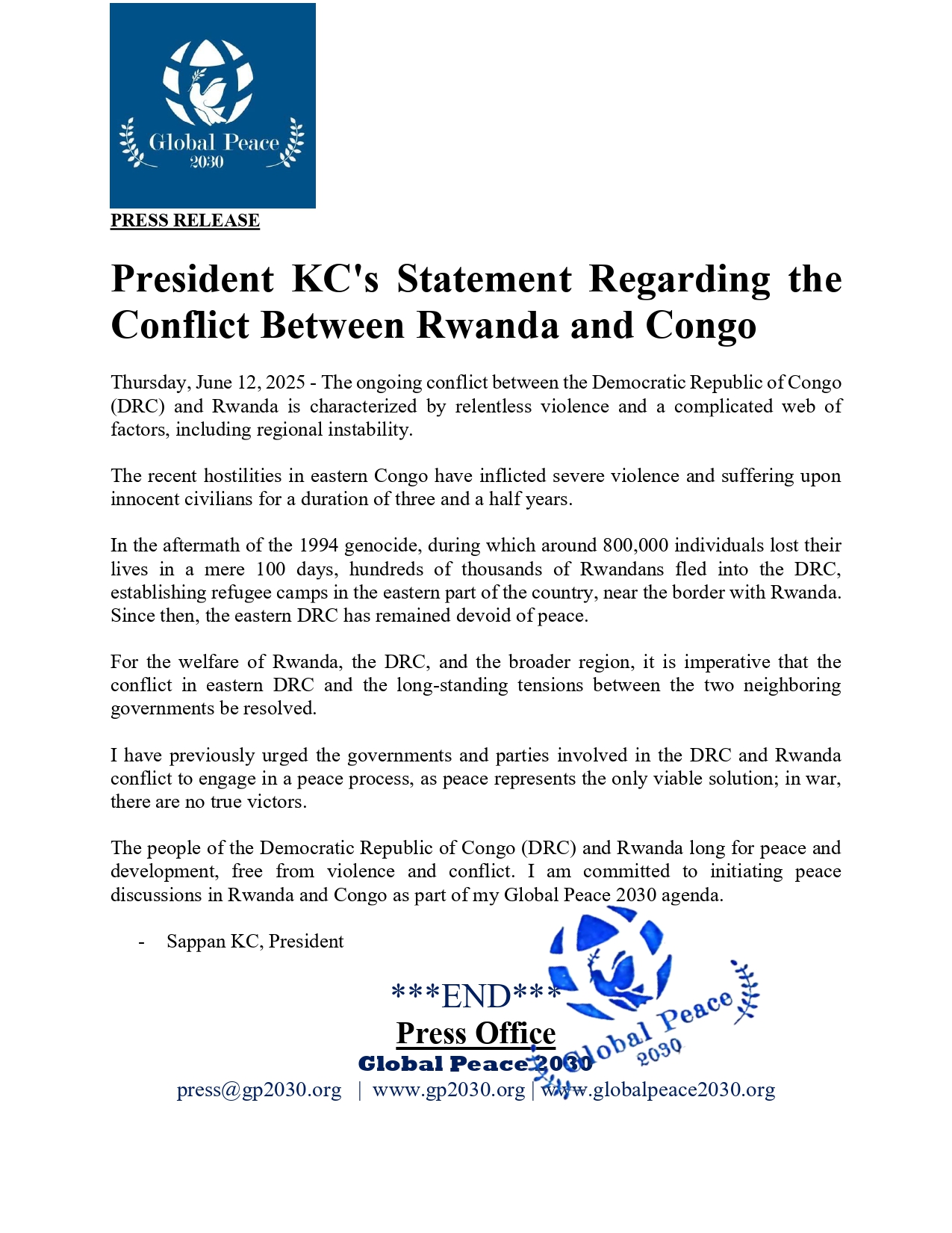 The people of the Democratic Republic of Congo (DRC) and Rwanda long for peace and development, free from violence and conflict. I am committed to initiating peace discussions in Rwanda and Congo as part of my Global Peace 2030 agenda.