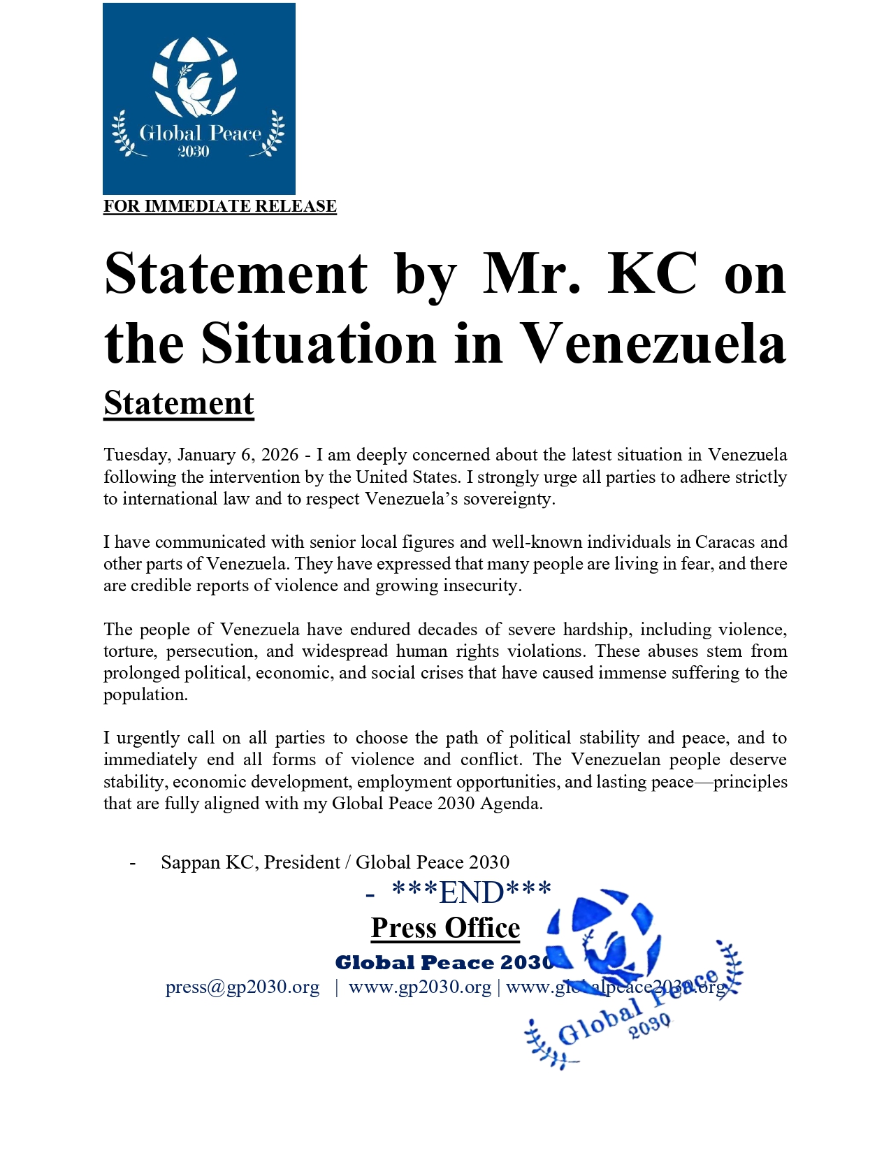 I urgently call on all parties to choose the path of political stability and peace, and to immediately end all forms of violence and conflict. The Venezuelan people deserve stability, economic development, employment opportunities, and lasting peace—principles that are fully aligned with my Global Peace 2030 Agenda.