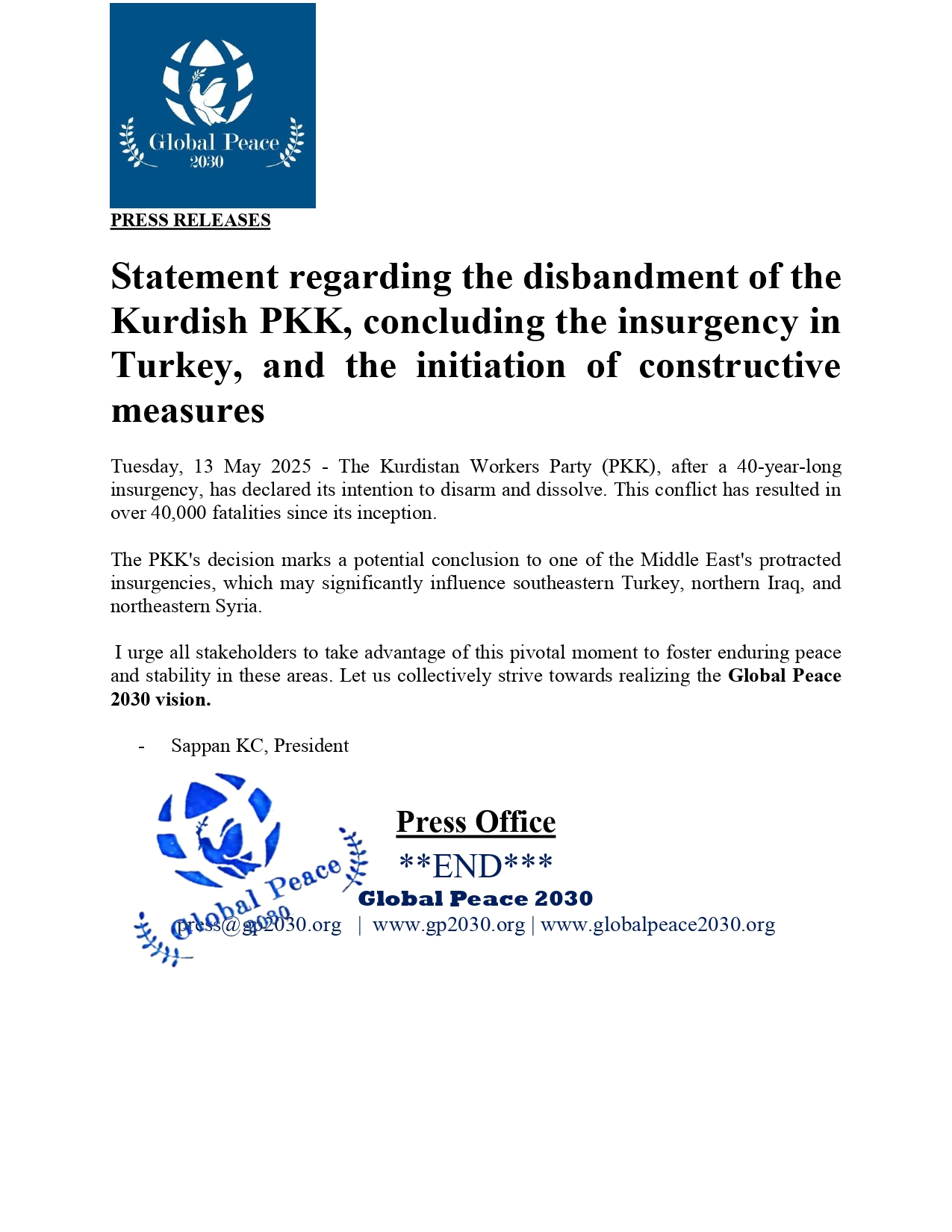 Statement regarding the disbandment of the Kurdish PKK, concluding the insurgency in Turkey, and the initiation of constructive measures