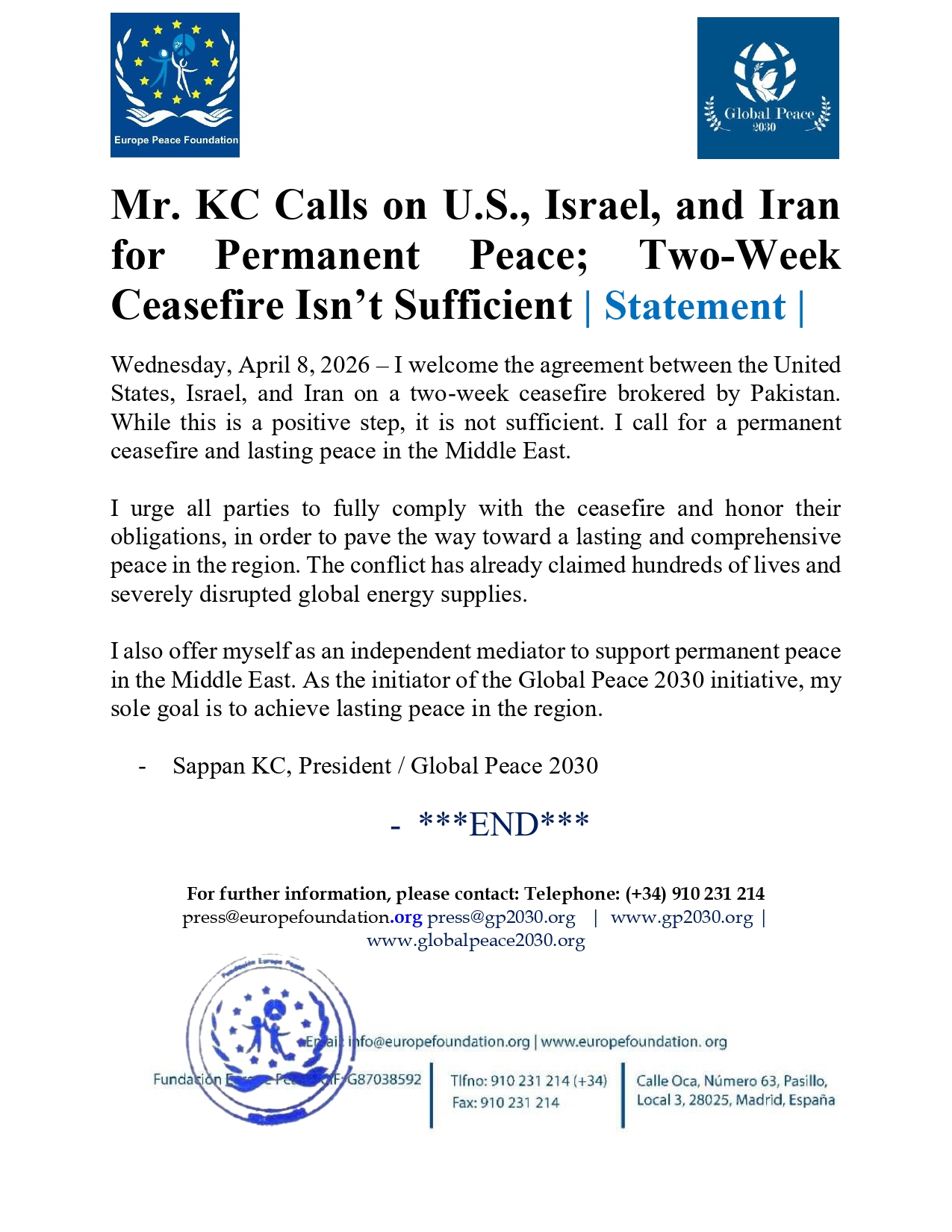 Mr. KC Calls on U.S., Israel, and Iran for Permanent Peace; Two‑Week Ceasefire Isn’t Sufficient