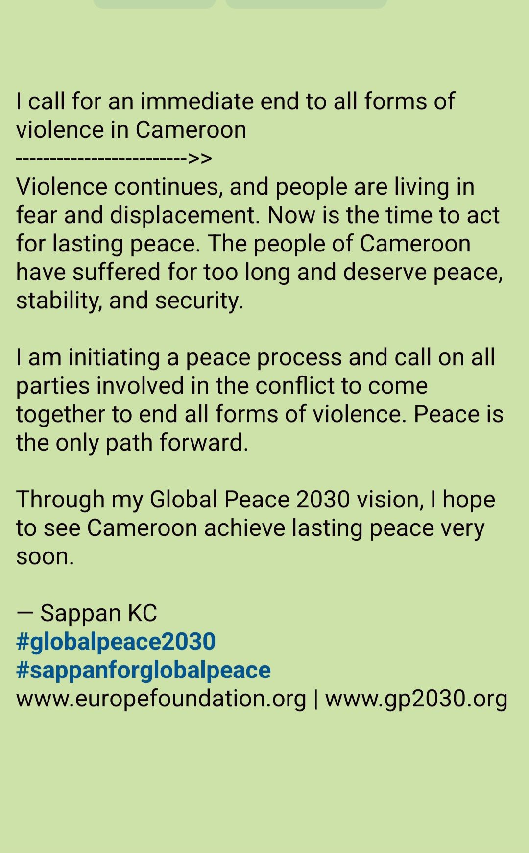 Through my Global Peace 2030 vision, I hope to see Cameroon achieve lasting peace very soon.